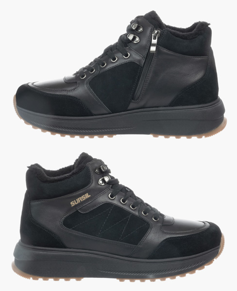 Верх из натуральной кожи черного цвета в сочетании с нубуком , дополненный черной массивной подошвой с каучуковым протектором - образец актуального стиля в сочетании с комфортом. Шерстяная подкладка и покрытие стельки обеспечат ногам тепло при минусовых температурах. Застежка на молнии с внутренней стороны в дополнение к шнуровке  значительно повышает удобство надевания. Анатомическая стелька с выраженной поддержкой сводов способствует распределению нагрузки на ноги и снижению усталости при ходьбе. Голеностоп надежно удерживается от завала плотным задником. Модель достаточно легкая, благодаря подошве из вспененного материала ЭВА, который еще и отлично амортизирует, а противоскользящий протектор обеспечивает устойчивость даже на скользких поверхностях. Подошва имеет перекатный профиль, что значительно снижает усталость при длительной ходьбе и благоприятно влияет на здоровье суставов и позвоночника.